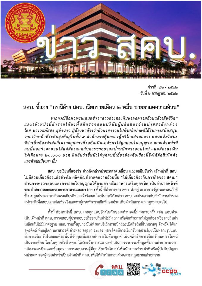 สคบ. ชี้แจง “กรณีอ้าง สคบ. เรียกรายเดือน ๒ หมื่น ขายยาลดความอ้วน”( webadmin )