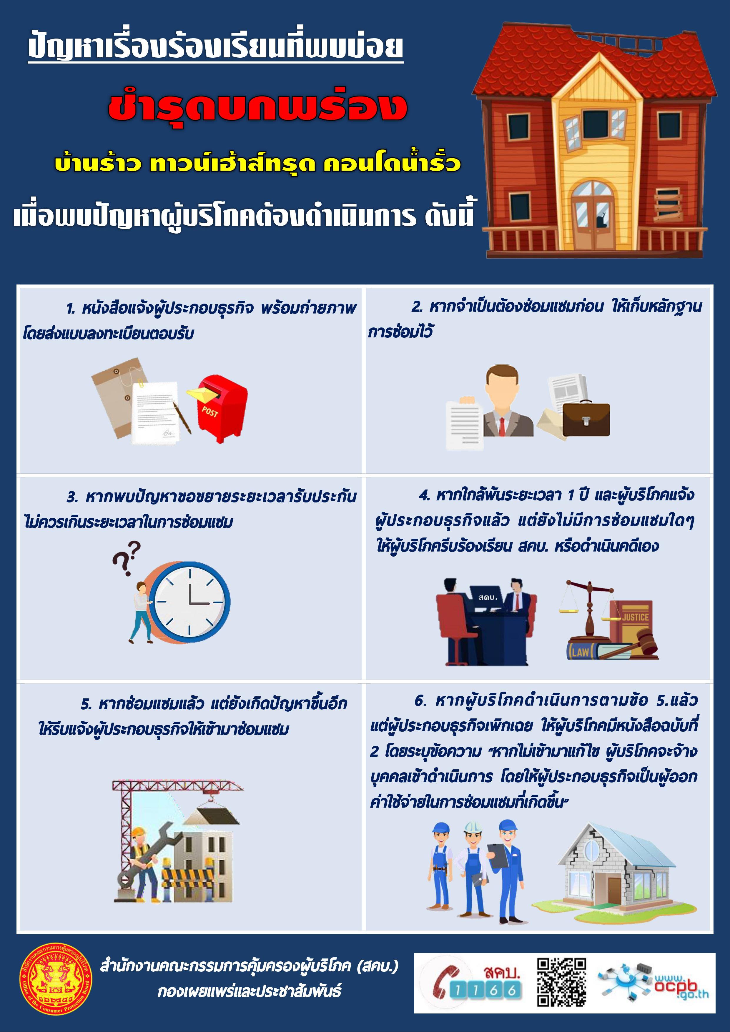 ปัญหาเรื่องร้องเรียนที่พบบ่อย ชำรุดบกพร่อง บ้านร้าว ทาวน์เฮ้าส์ทรุด คอนโดน้ำรั้ว เมื่อพบปัญหาผู้บริโภคต้องดำเนินการ ดังนี้