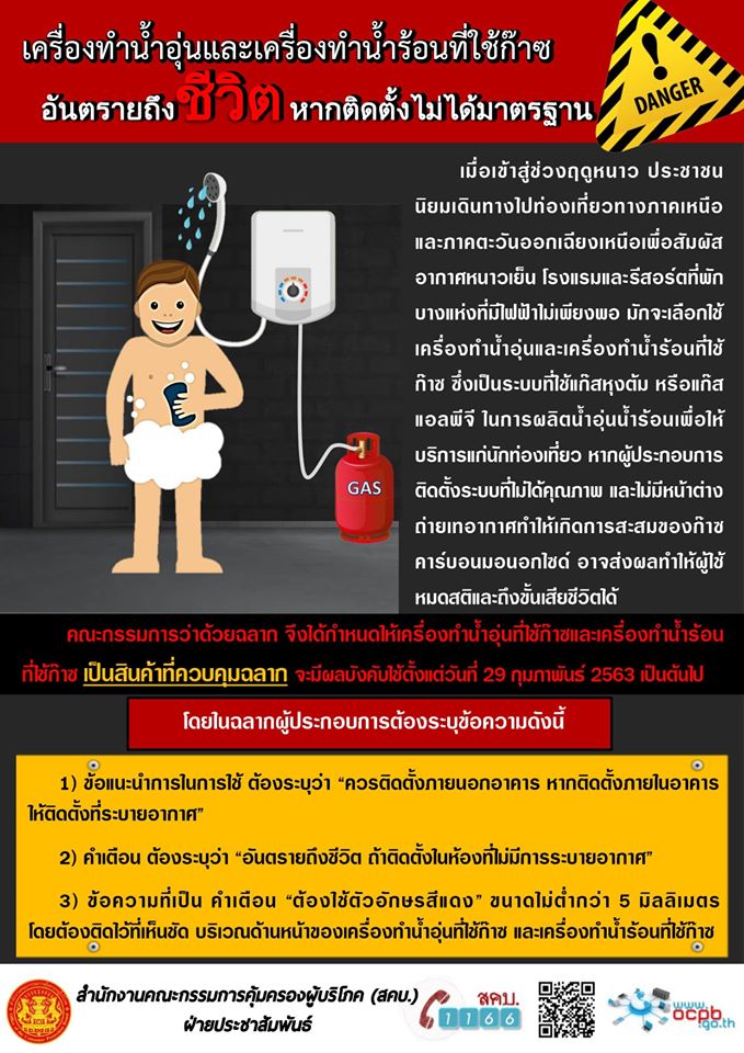 เครื่องทำน้ำอุ่นและเครื่องทำน้ำร้อนที่ใช้ก๊าซ อันตรายถึงชีวิตหากติดตั้งไม่ได้มาตราฐาน