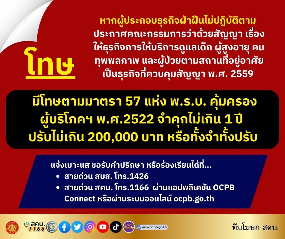 หากผู้ประกอบธุรกิจฝ่าฝืนไม่ปฏิบัติตามประกาศคณะกรรมการว่าด้วยสัญญา เรื่อง ให้ธุรกิจการให้บริการดูแลเด็ก ผู้สูงอายุ คนทุพพลภาพ และผู้ป่วยตามสถานที่อยู่อาศัย เป็นธุรกิจที่ควบคุมสัญญา พ.ศ. 2559