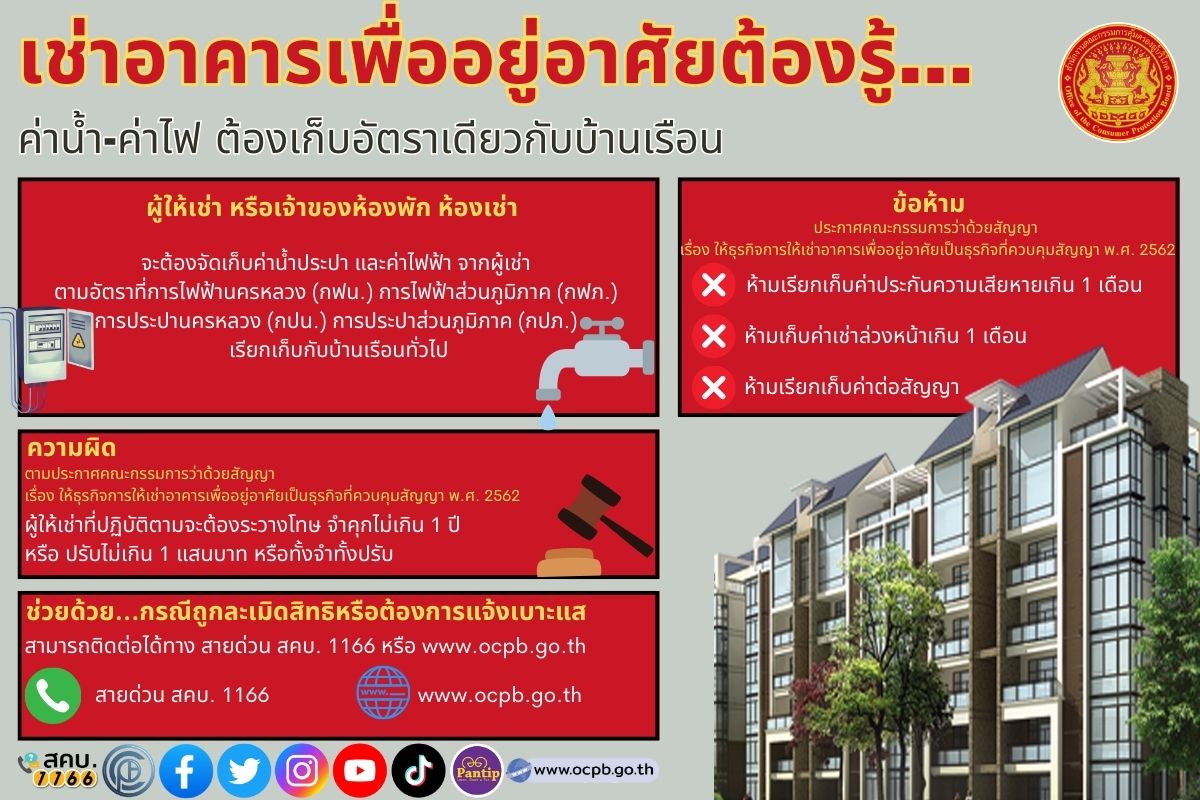 เช่าอาคารเพื่ออยู่อาศัยต้องรู้...ค่าน้ำ-ค่าไฟ ต้องเก็บอัตราเดียวกับบ้านเรือน