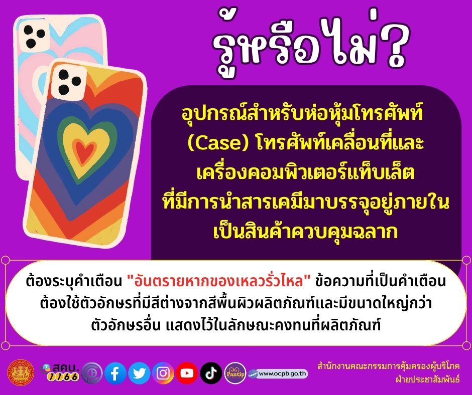 รู้ หรือ ไม่ อุปกรณ์สำหรับห่อหุ้มโทรศัพท์ (Case) โทรศัพท์เคลื่อนที่และเครื่องคอมพิวเตอร์แท็บเล็ตที่มีการนำสารเคมีมาบรรจุอยู่ภายใน เป็นสินค้าควบคุมฉลาก
