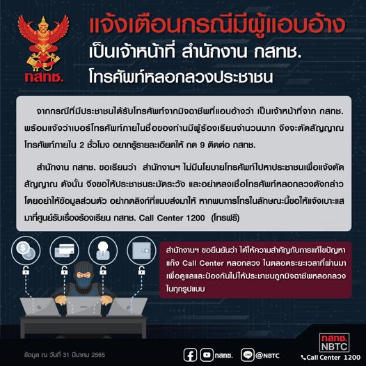 แจ้งเตือนกรณีมีผู้แอบอ้างเป็นเจ้าหน้าที่ สำนักงาน กสทช. โทรศัพท์หลอกลวงประชาชน