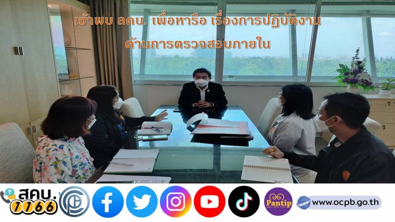 เมื่อวันพฤหัสบดีที่ 22 กันยายน 2565 เวลา 09.00 น.  นางวารุณี ฤทธิ์งาน ผู้อำนวยการกลุ่มตรวจสอบภายใน พร้อมด้วย เจ้าหน้าที่กลุ่มตรวจสอบภายใน สคบ. เข้าพบ นายธสรณ์อัฑฒ์ ธนิทธิพันธ์ เลขาธิการคณะกรรมการคุ้มครองผู้บริโภค เพื่อหารือเกี่ยวกับการปฏิบัติงานด้านการตรวจสอบภายในตามหลักเกณฑ์กระทรวงการคลังว่าด้วยมาตรฐานและหลักเกณฑ์ปฏิบัติการตรวจสอบภายในหน่วยงานของรัฐ พ.ศ. 2561 และที่แก้ไขเพิ่มเติม พร้อมทั้ง ชี้แจงถึงแนวทางการประกันและการปรับปรุงคุณภาพงานตรวจสอบภายใน ซึ่งหน่วยงานจะต้องเข้ารับการประเมินในปี งบประมาณ พ.ศ. 2567