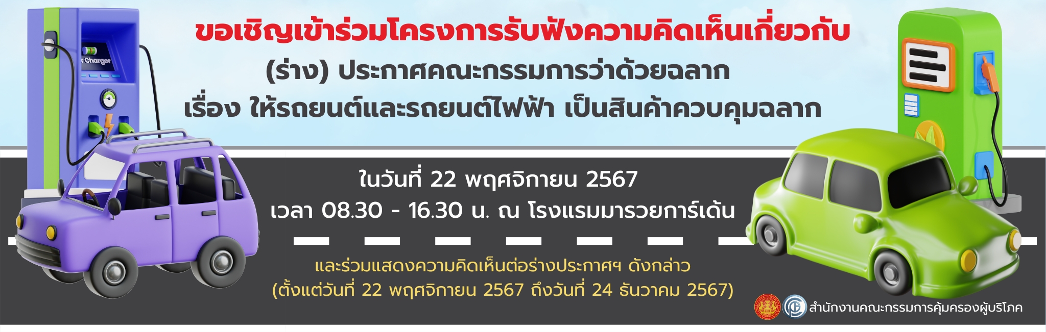 ขอเชิญเข้าร่วมโครงการรับฟังความคิดเห็นเกี่ยวกับ (ร่าง) ประกาศคณะกรรมการว่าด้วยฉลาก เรื่อง ให้รถยนต์และรถยนต์ไฟฟ้า เป็นสินค้าควบคุมฉลาก