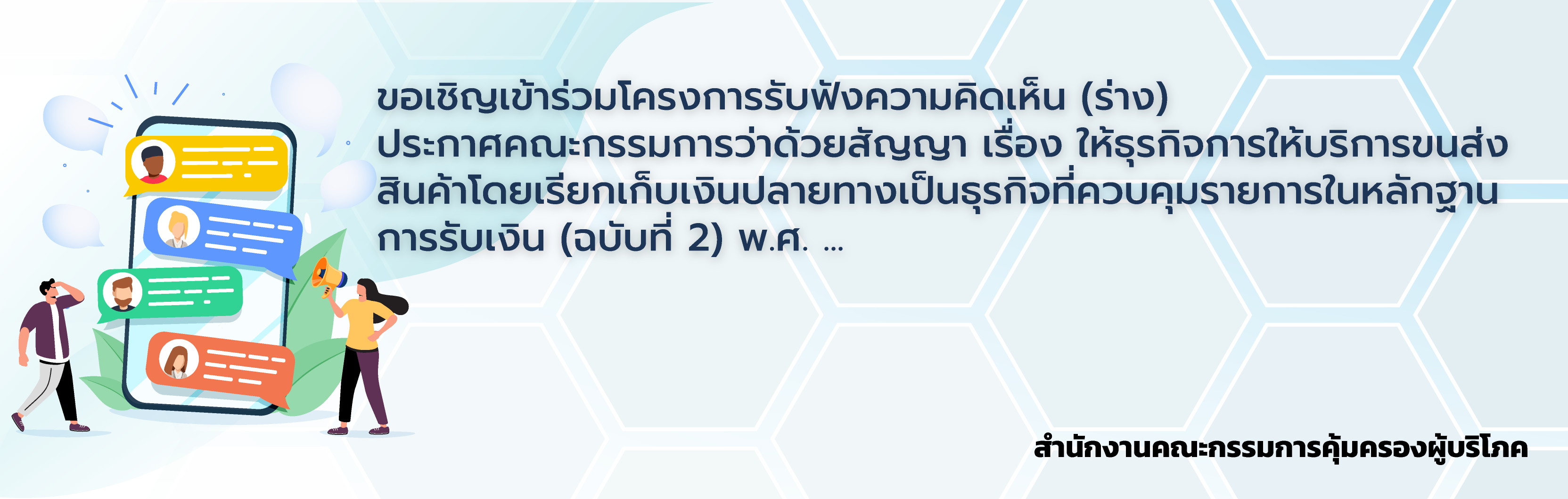 ขอเชิญเข้าร่วมโครงการรับฟังความคิดเห็น (ร่าง) ประกาศคณะกรรมการว่าด้วยสัญญา เรื่อง ให้ธุรกิจการให้บริการขนส่งสินค้าโดยเรียกเก็บเงินปลายทางเป็นธุรกิจที่ควบคุมรายการในหลักฐานการรับเงิน (ฉบับที่ 2) พ.ศ. ...