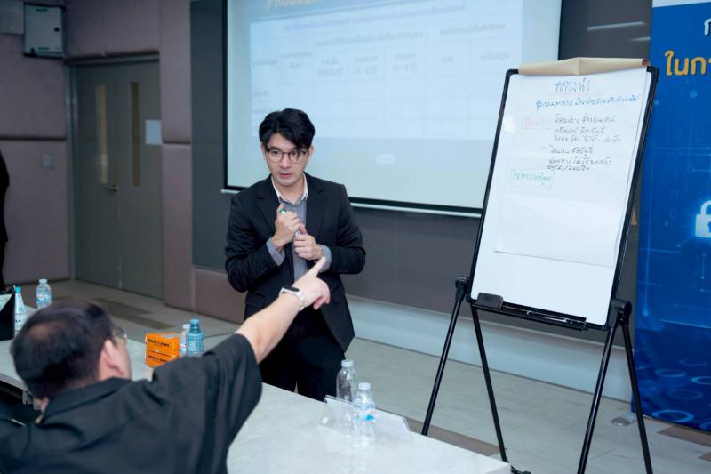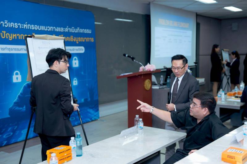 สำหรับการจัดกิจกรรม Workshop ครั้งที่ 1 (ช่วงเช้า) เป็นกิจกรรมการประชุมเชิงปฏิบัติการ (Workshop) ประเด็นการบริหารจัดการการทำธุรกรรมทางการเงินผ่านระบบอิเล็กทรอนิกส์ และครั้งที่ 2 (ช่วงบ่าย) เป็นกิจกรรมการประชุมเชิงปฏิบัติการ (Workshop) ประเด็นการบริการดิจิทัล ซึ่งทั้งสองกิจกรรมได้รับเกียรติบรรยายโดย ดร.ชาญเดช เจริญวิริยะกุล อาจารย์ที่ปรึกษาฯ อธิบายประเด็นดังกล่าว โดยแบ่งกลุ่มเป้าหมายออกเป็น 3 กลุ่ม (กลุ่มต้นน้ำ กลุ่มกลางน้ำ กลุ่มปลายน้ำ) วิเคราะห์และแสดงความคิดเห็นเกี่ยวกับปัญหาการทำธุรกรรมทางการเงินผ่านระบบอิเล็กทรอนิกส์และการบริการดิจิทัล สรุปแนวการการแก้ปัญหาเชิงบูรณาการทั้งระยะสั้น ระยะกลาง และระยะยาว รวมตลอดจนสรุปหน่วยงานที่รับผิดชอบ (หน่วยงานหลักและหน่วยงานสนับสนุน) ในการดำเนินการแก้ไขปัญหาดังกล่าว