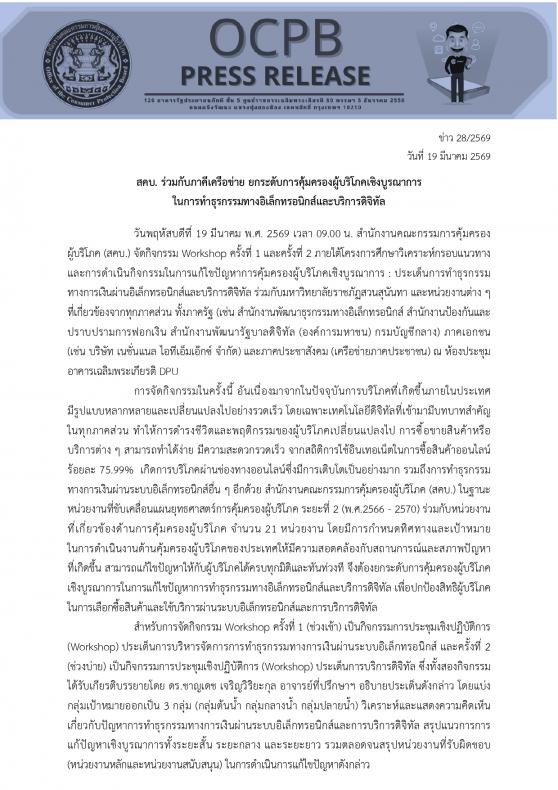 วันพฤหัสบดีที่ 19 มีนาคม พ.ศ. 2569 เวลา 09.00 น. สำนักงานคณะกรรมการคุ้มครองผู้บริโภค (สคบ.) จัดกิจกรรม Workshop ครั้งที่ 1 และครั้งที่ 2 ภายใต้โครงการศึกษาวิเคราะห์กรอบแนวทางและการดําเนินกิจกรรมในการแก้ไขปัญหาการคุ้มครองผู้บริโภคเชิงบูรณาการ : ประเด็นการทําธุรกรรมทางการเงินผ่านอิเล็กทรอนิกส์และบริการดิจิทัล ร่วมกับมหาวิทยาลัยราชภัฏสวนสุนันทา และหน่วยงานต่าง ๆที่เกี่ยวข้องจากทุกภาคส่วน ทั้งภาครัฐ (เช่น สำนักงานพัฒนาธุรกรรมทางอิเล็กทรอนิกส์ สำนักงานป้องกันและปราบปรามการฟอกเงิน สำนักงานพัฒนารัฐบาลดิจิทัล (องค์การมหาชน) กรมบัญชีกลาง) ภาคเอกชน (เช่น บริษัท เนชั่นแนล ไอทีเอ็มเอ๊กซ์ จำกัด) และภาคประชาสังคม (เครือข่ายภาคประชาชน) ณ ห้องประชุมอาคารเฉลิมพระเกียรติ DPU