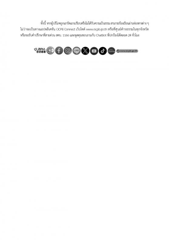 ทั้งนี้ หากผู้บริโภคถูกเอารัดเอาเปรียบหรือไม่ได้รับความเป็นธรรม สามารถร้องเรียนผ่านช่องทางต่าง ๆ ไม่ว่าจะเป็นทางแอปพลิเคชัน OCPB Connect เว็บไซต์ www.ocpb.go.th หรือที่ศูนย์ดำรงธรรมในทุกจังหวัดหรือขอรับคำปรึกษาที่สายด่วน สคบ. 1166 และพูดคุยสอบถามกับ ChatBot พี่ปกป้องได้ตลอด 24 ชั่วโมง