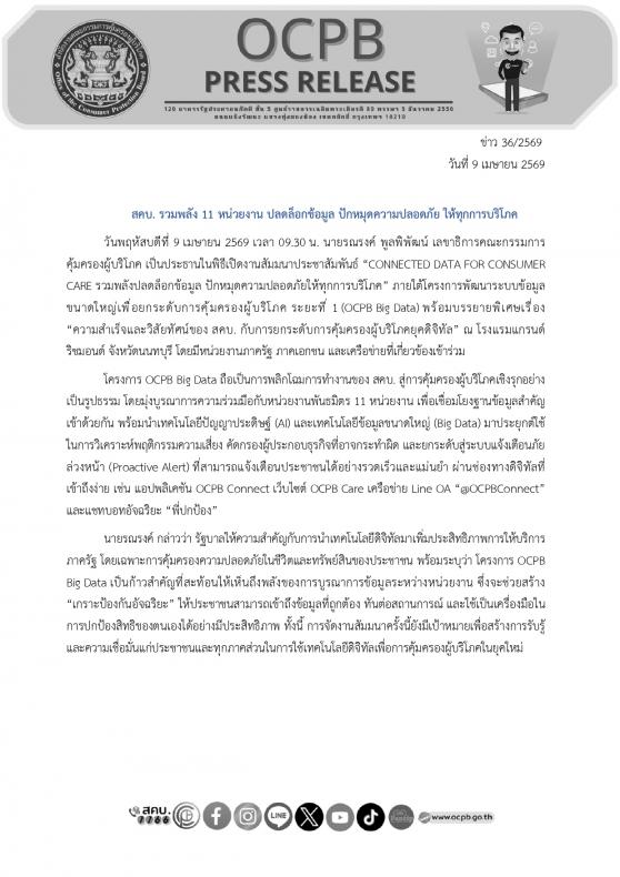 โครงการ OCPB Big Data ถือเป็นการพลิกโฉมการทำงานของ สคบ. สู่การคุ้มครองผู้บริโภคเชิงรุกอย่างเป็นรูปธรรม โดยมุ่งบูรณาการความร่วมมือกับหน่วยงานพันธมิตร 11 หน่วยงาน เพื่อเชื่อมโยงฐานข้อมูลสำคัญเข้าด้วยกัน พร้อมนำเทคโนโลยีปัญญาประดิษฐ์ (AI) และเทคโนโลยีข้อมูลขนาดใหญ่ (Big Data) มาประยุกต์ใช้ในการวิเคราะห์พฤติกรรมความเสี่ยง คัดกรองผู้ประกอบธุรกิจที่อาจกระทำผิด และยกระดับสู่ระบบแจ้งเตือนภัยล่วงหน้า (Proactive Alert) ที่สามารถแจ้งเตือนประชาชนได้อย่างรวดเร็วและแม่นยำ ผ่านช่องทางดิจิทัลที่เข้าถึงง่าย เช่น แอปพลิเคชัน OCPB Connect เว็บไซต์ OCPB Care เครือข่าย Line OA “@OCPBConnect” และแชทบอทอัจฉริยะ “พี่ปกป้อง”
