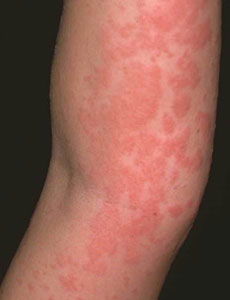 โรคลมพิษ คือโรคที่ผิวหนังมีลักษณะเป็นผื่นนูนแดง ไม่มีขุย มีอาการคัน เมื่อเกาหรือลูบ ผื่นจะยิ่งขึ้นตามมา เกิดขึ้นได้ทั่วร่างกาย ผื่นมักจะเป็นอยู่ไม่นาน โดยมากมักไม่เกิน 24 ชั่วโมง ก็จะยุบไปเองโดยไม่มีร่องรอย แต่ก็อาจมีผื่นเกิดขึ้นใหม่ในที่อื่นๆ ได้