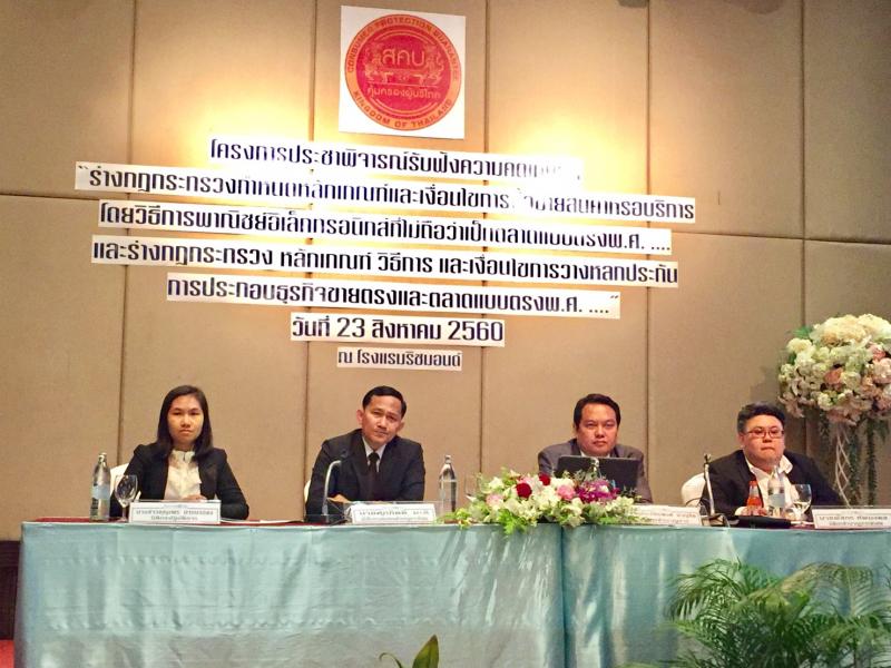 วันพุธที่ 23 สิงหาคม 2560 พลตำรวจตรี ประสิทธิ์ เฉลิมวุฒิศักดิ์ เลขาธิการคณะกรรมการคุ้มครองผู้บริโภค เป็นประธานในพิธีเปิดโครงการประชาพิจารณ์รับฟังความคิดเห็นต่อ "ร่างกฎกระทรวงกำหนดหลักเกณฑ์และเงื่อนไขการซื้อขายสินค้าหรือบริการ โดยวิธีการพาณิชย์อิเล็กทรอนิกส์ที่ไม่ถือว่าเป็นตลาดแบบตรง พ.ศ. .... และร่างกฎกระทรวง หลักเกณฑ์ วิธีการ และเงื่อนไขการวางหลักประกันการประกอบธุรกิจขายตรงและตลาดแบบตรง พ.ศ. ....” ณ โรงแรมริชมอนด์ นนทบุรี ซึ่งในช่วงเช้ามีการบรรยายในหัวข้อความเป็นมาและหลักการของร่างกฎกระทรวงทั้ง 2 ฉบับนี้ วิทยากรผู้ทรงคุณวุฒินางสาววันดี สุชาติกุลวิทย์ และนายพัสกร ทัพมงคล อนุกรรมการพิจารณาจัดทำร่างกฎ ระเบียบ ประกาศ และคำสั่ง ตามพระราชบัญญัติขายตรงและตลาดแบบตรง พ.ศ. 2545 นายพิศิษฐ์ แทนทิว กรรมการขายตรงและตลาดแบบตรงและนายประภัทรพงศ์ ชาญชิต วิทยากรผู้ดำเนินรายการ การจัดงานเพื่อให้ผู้เข้าร่วมโครงการได้รับทราบ