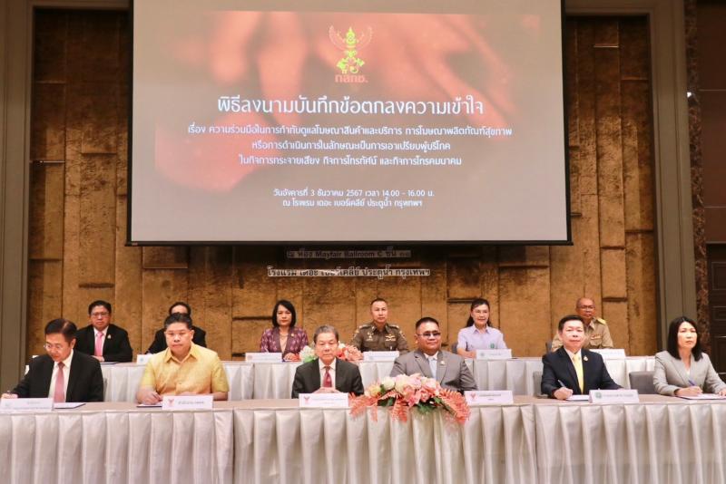 วันอังคารที่ 3 ธันวาคม 2567 เวลา 10.00 – 16.00 น. นางสาวทรงศิริ จุมพล รองเลขาธิการคณะกรรมการคุ้มครองผู้บริโภค รักษาราชการแทนเลขาธิการ สคบ. ได้เข้าร่วมพิธีลงนามบันทึกข้อตกลงความเข้าใจ เรื่อง ความร่วมมือในการกำกับดูแลการโฆษณาสินค้าและบริการ การโฆษณาผลิตภัณฑ์สุขภาพหรือการดำเนินการในลักษณะเป็นการเอาเปรียบผู้บริโภคในกิจการกระจายเสียง กิจการโทรทัศน์และกิจการโทรคมนาคม ณ ห้อง Mayfair C Grand Ballroom โรงแรม เดอะ เบอร์เคลีย์ ประตูน้ำ กรุงเทพฯ