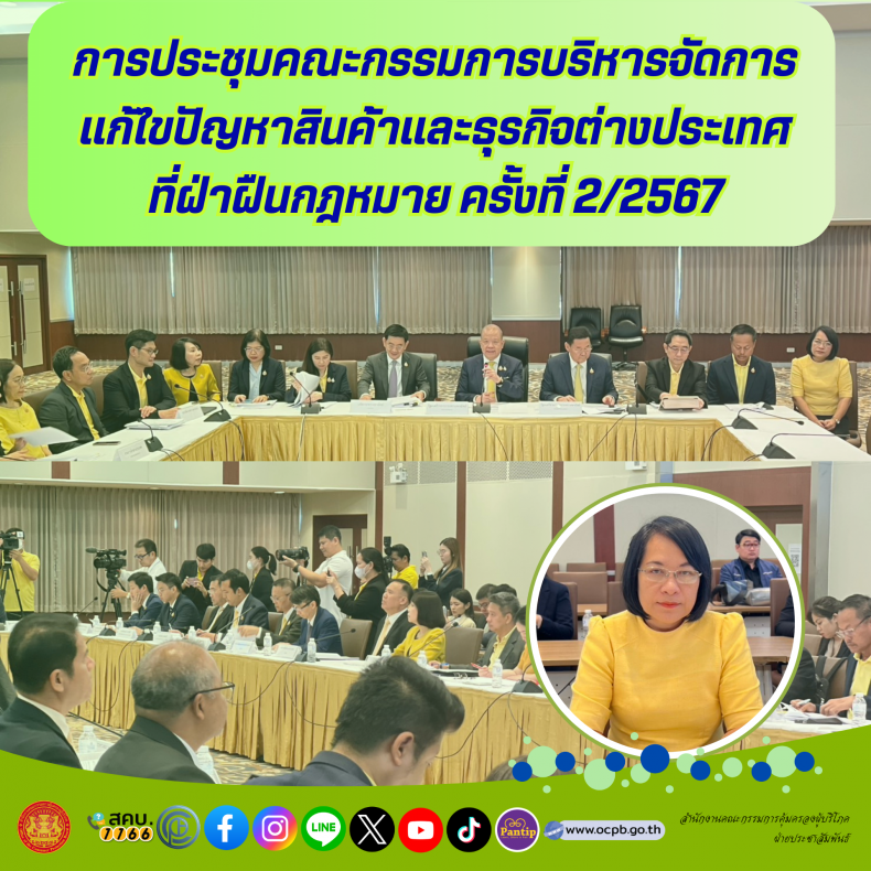 วันจันทร์ที่ 9 ธันวาคม พ.ศ. 2567 เวลา 13.30 น. นางสาวทรงศิริ จุมพล รองเลขาธิการคณะกรรมการคุ้มครองผู้บริโภค รักษาราชการแทน เลขาธิการคณะกรรมการคุ้มครองผู้บริโภค เข้าร่วมการประชุมคณะกรรมการบริหารจัดการแก้ไขปัญหาสินค้าและธุรกิจต่างประเทศที่ฝ่าฝืนกฎหมาย ครั้งที่ 2/2567 โดยที่ประชุมได้มีการรับรองรายงานการประชุมคณะกรรมการบริหารจัดการแก้ไขปัญหาสินค้าและธุรกิจต่างประเทศที่ฝ่าฝืนกฎหมาย ครั้งที่ 1/2567 การรายงานผลการประชุมคณะอนุกรรมการส่งเสริมและยกระดับ SMEs ไทยและแก้ไขปัญหาสินค้าที่ไม่มีคุณภาพจากต่างประเทศ และผลการประชุมคณะอนุกรรมการป้องกันและป้องปรามธุรกิจอำพรางของคนต่างด้าว (Nominee) รวมทั้งมีการพิจารณาแผนการส่งเสริมและยกระดับ SMEs ไทยและแก้ไขปัญหา สินค้าที่ไม่มีคุณภาพจากต่างประเทศระยะสั้น-กลาง-ยาว เกี่ยวกับแนวทางการบริหารจัดการแก้ไขปัญหาสินค้าและธุรกิจต่างประเทศที่ฝ่าฝืนกฎหมาย แนวทางการส่งเสริมและยกระดับ SMEs ไทย และพิจารณาแผนการป้องกันและป้องปรามธุรกิจอำพรางของคนต่างด้าว (Nominee) ระยะสั้น-กลาง-ยาว ร่วมกับหน่วยงานต่าง ๆ ณ ห้องมโนปกรณ์นิติธาดา ชั้น 12 สำนักงานปลัดกระทรวงพาณิชย์