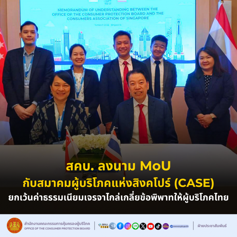 สคบ. ลงนาม MoU กับสมาคมผู้บริโภคแห่งสิงคโปร์ (CASE) ยกเว้นค่าธรรมเนียมเจรจาไกล่เกลี่ยข้อพิพาทให้ผู้บริโภคไทย