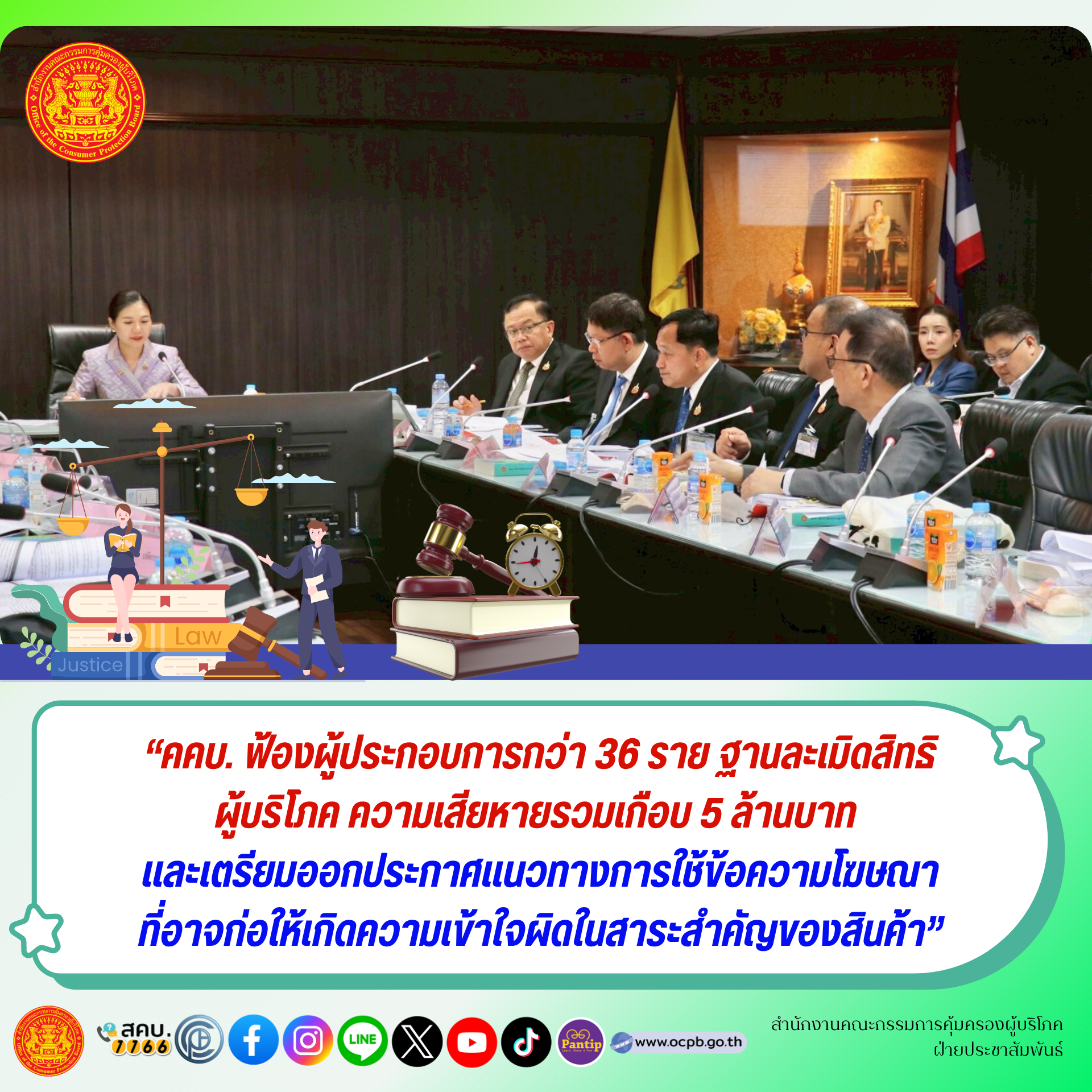 “คคบ. ฟ้องผู้ประกอบการกว่า 36 ราย ฐานละเมิดสิทธิผู้บริโภคความเสียหายรวมเกือบ 5 ล้านบาท และเตรียมออกประกาศแนวทางการใช้ข้อความโฆษณาที่อาจก่อให้เกิดความเข้าใจผิดในสาระสำคัญของสินค้า”