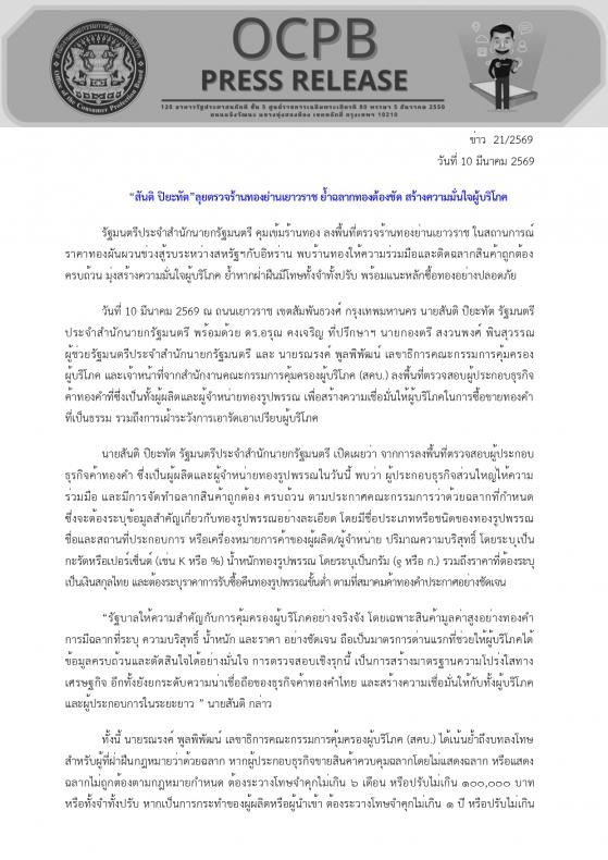 ผู้ช่วยรัฐมนตรีประจำสำนักนายกรัฐมนตรี และ นายรณรงค์ พูลพิพัฒน์ เลขาธิการคณะกรรมการคุ้มครองผู้บริโภค และเจ้าหน้าที่จากสำนักงานคณะกรรมการคุ้มครองผู้บริโภค (สคบ.) ลงพื้นที่ตรวจสอบผู้ประกอบธุรกิจค้าทองคำที่ซึ่งเป็นทั้งผู้ผลิตและผู้จำหน่ายทองรูปพรรณ เพื่อสร้างความเชื่อมั่นให้ผู้บริโภคในการซื้อขายทองคำ