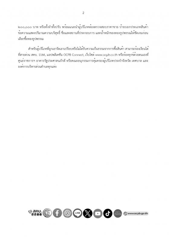 สำหรับผู้บริโภคที่ถูกเอารัดเอาเปรียบหรือไม่ได้รับความเป็นธรรมจากการซื้อสินค้า สามารถร้องเรียนได้ที่สายด่วน สคบ. 1166, แอปพลิเคชัน OCPB Connect, เว็บไซต์ www.ocpb.co.th หรือร้องทุกข์ด้วยตนเองที่ศูนย์ราชการฯ อาคารรัฐประศาสนภักดี หรือคณะอนุกรรมการคุ้มครองผู้บริโภคประจำจังหวัด เทศบาล และองค์การบริหารส่วนตำบลทุกแห่ง