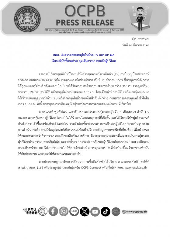 จากกรณีเกิดเหตุเพลิงไหม้รถยนต์นั่งส่วนบุคคลพลังงานไฟฟ้า (EV) ภายในหมู่บ้านชัยพฤกษ์ บางแวก ถนนบางแวก แขวงบางไผ่ เขตบางแค เมื่อช่วงบ่ายของวันที่ 25 มีนาคม 2569 ซึ่งเหตุการณ์ดังกล่าว