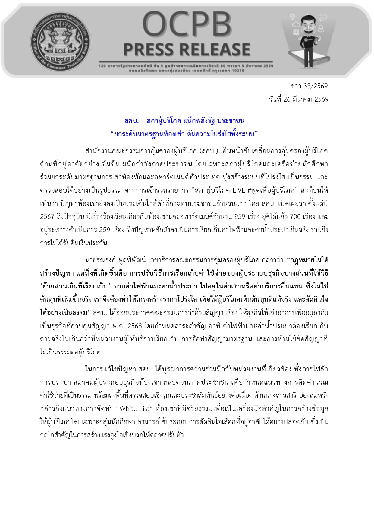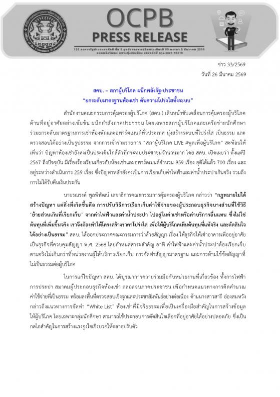 ร่วมยกระดับมาตรฐานการเช่าห้องพักและอพาร์ตเมนต์ทั่วประเทศ มุ่งสร้างระบบที่โปร่งใส เป็นธรรม และตรวจสอบได้อย่างเป็นรูปธรรม จากการเข้าร่วมรายการ “สภาผู้บริโภค LIVE #พูดเพื่อผู้บริโภค” สะท้อนให้