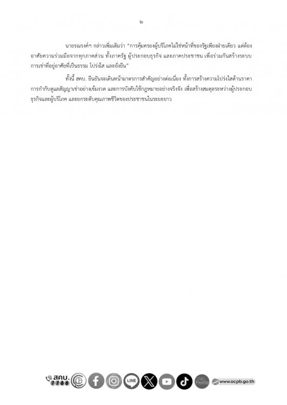 ทั้งนี้ สคบ. ยืนยันจะเดินหน้ามาตรการสำคัญอย่างต่อเนื่อง ทั้งการสร้างความโปร่งใสด้านราคา การกำกับดูแลสัญญาเช่าอย่างเข้มงวด และการบังคับใช้กฎหมายอย่างจริงจัง เพื่อสร้างสมดุลระหว่างผู้ประกอบธุรกิจและผู้บริโภค และยกระดับคุณภาพชีวิตของประชาชนในระยะยาว