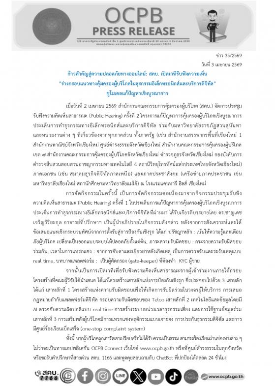เมื่อวันที่ 2 เมษายน 2569 สำนักงานคณะกรรมการคุ้มครองผู้บริโภค (สคบ.) จัดการประชุมรับฟังความคิดเห็นสาธารณะ (Public Hearing) ครั้งที่ 2 โครงการแก้ปัญหาการคุ้มครองผู้บริโภคเชิงบูรณาการ ประเด็นการทำธุรกรรมทางอิเล็กทรอนิกส์และบริการดิจิทัล ร่วมกับมหาวิทยาลัยราชภัฏสวนสุนันทา
