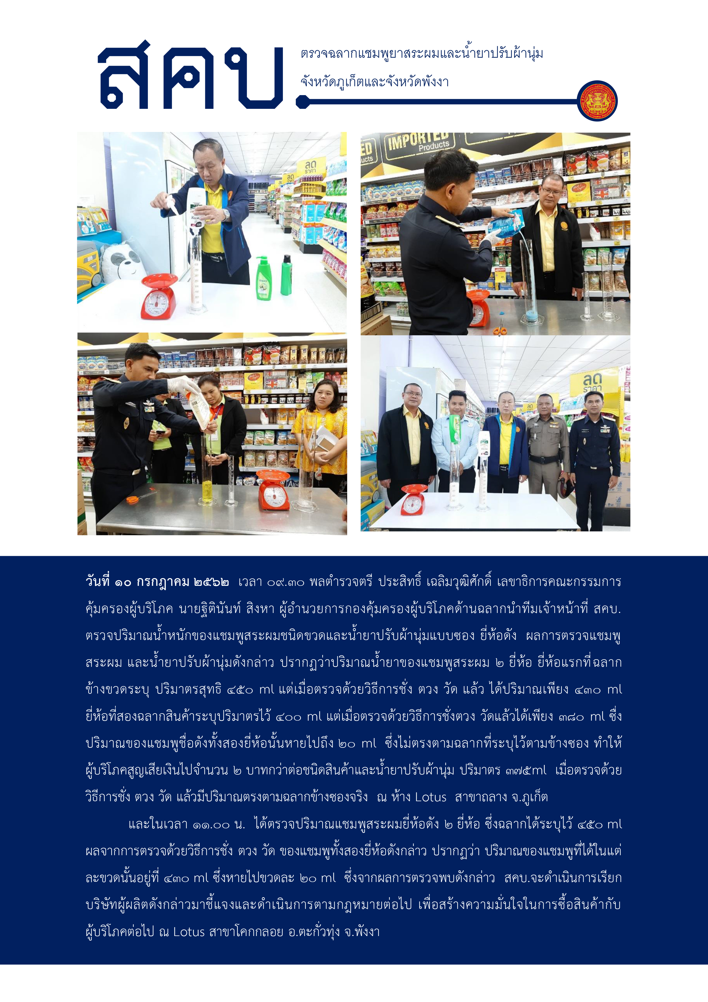 สคบ.ตรวจฉลากแชมพูยาสระผมและน้ำยาปรับผ้านุ่ม จังหวัดภูเก็ตและจังหวัดพังงา