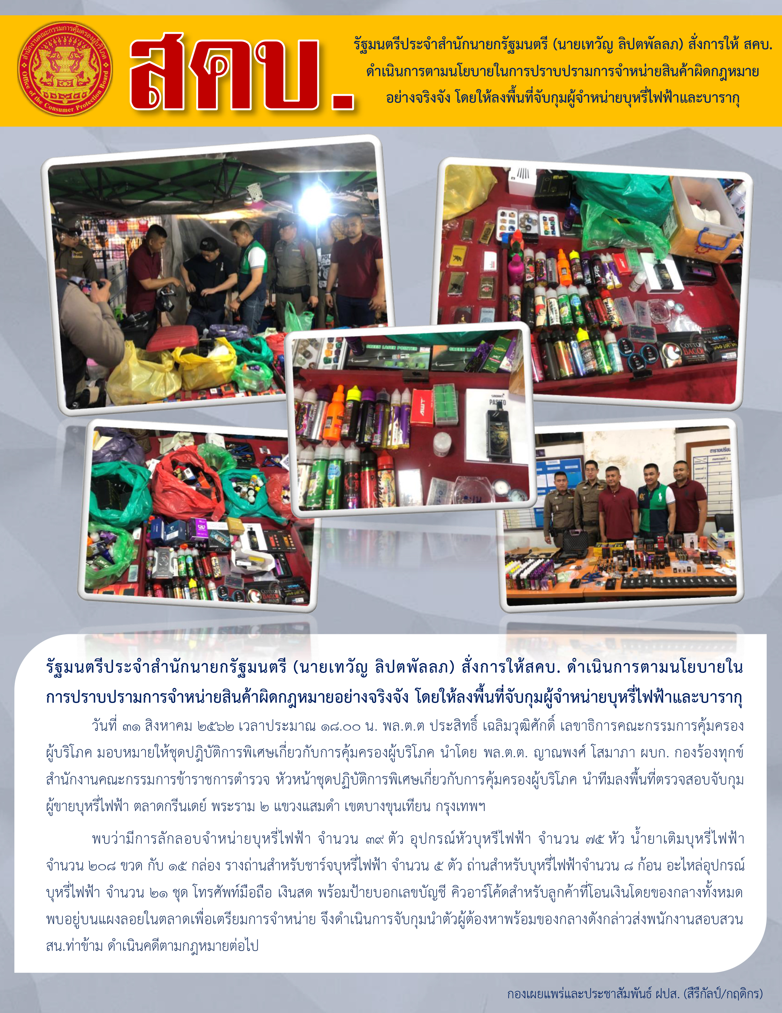 รัฐมนตรีประจำสำนักนายกรัฐมนตรี (นายเทวัญ ลิปตพัลลภ) สั่งการให้ สคบ. ดำเนินการตามนโยบายในการปราบปรามการจำหน่ายสินค้าผิดกฎหมายอย่างจริงจัง โดยให้ลงพื้นที่จับกุมผู้จำหน่ายบุหรี่ไฟฟ้าและบารากุ