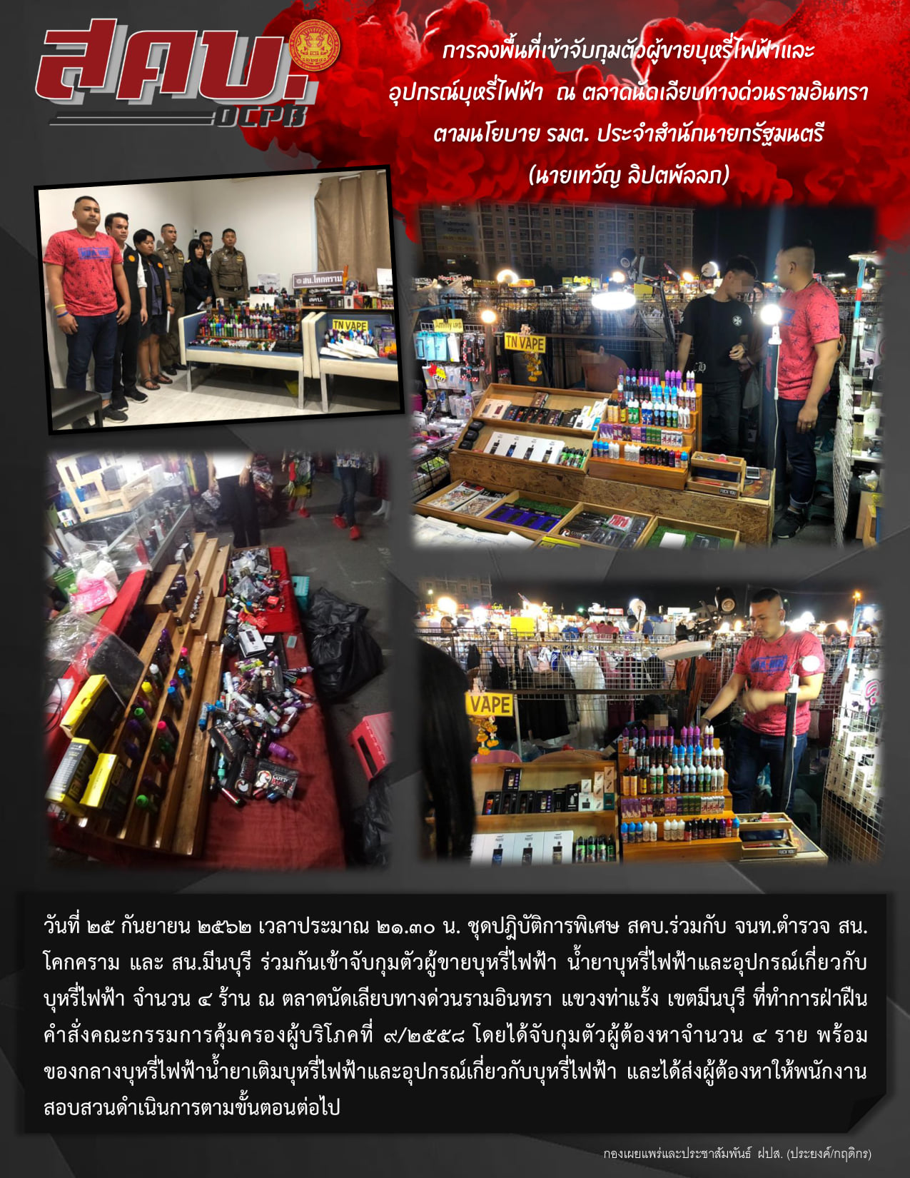 การลงพื้นที่เข้าจับกุมตัวผู้ขายบุหรี่ไฟฟ้าและอุปกรณ์บุหรีไฟฟ้า ณ ตลาดนัดเลียบทางด่วนรามอินทรา ตามนโยบาย รมต. ประจำสำนักนายกรัฐมนตรี (นายเทวัญ ลิปตพัลลภ)