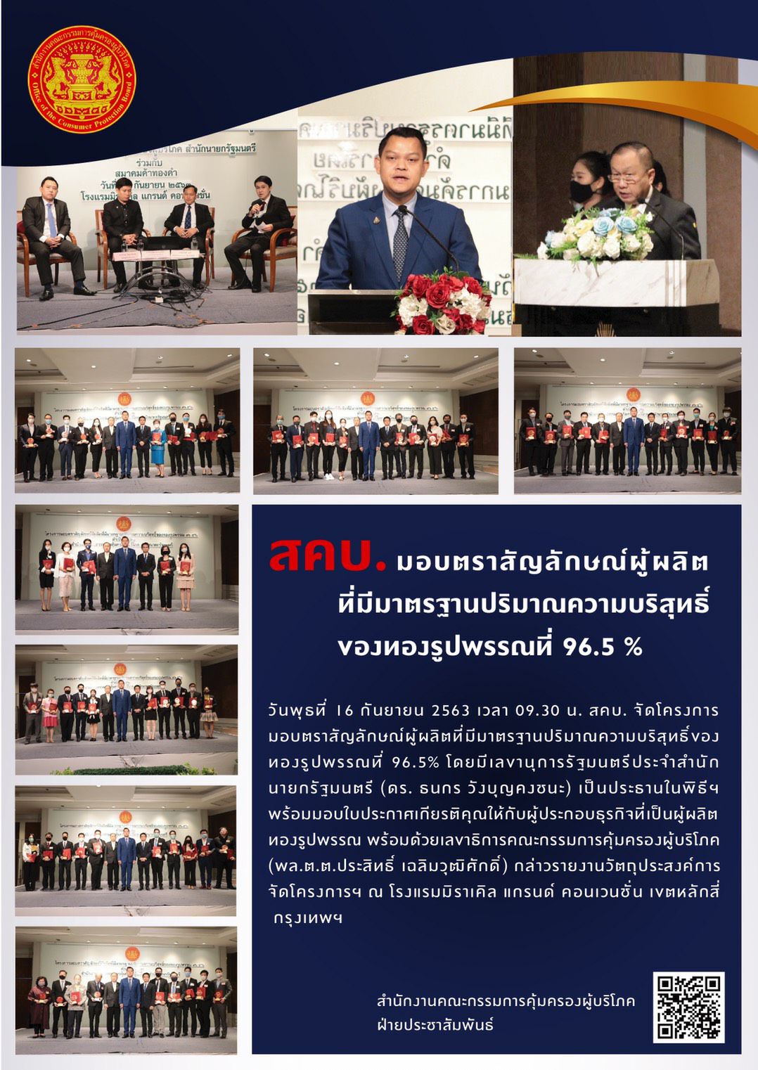 สคบ.มอบตราสัญลักษณ์ผู้ผลิตที่มีมาตรฐานปริมาณความบริสุทธิ์ของทองรูปพรรณที่ 96.5%