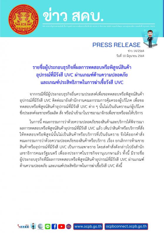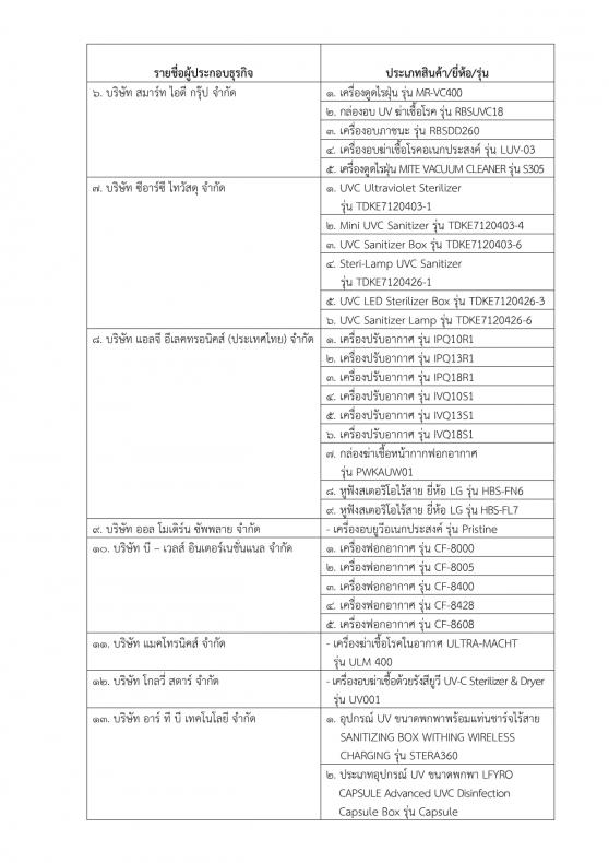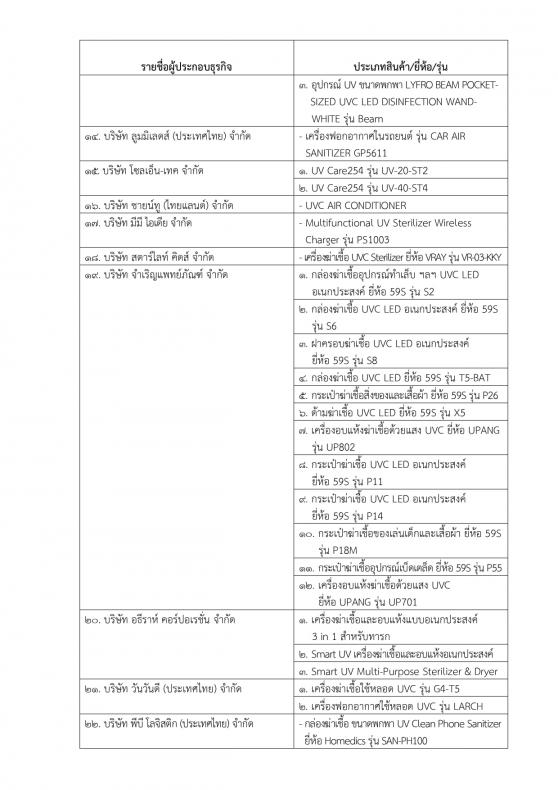 ประกาศรายชื่อผู้ประกอบการที่ผลการทดสอบหรือพิสูจน์สินค้าอุปกรณ์ที่มีรังสี​ UVC ผ่านเกณฑ์ด้านความปลอดภัยและเกณฑ์​ประสิทธิภาพในการฆ่าเชื้อรังสี​ UVC