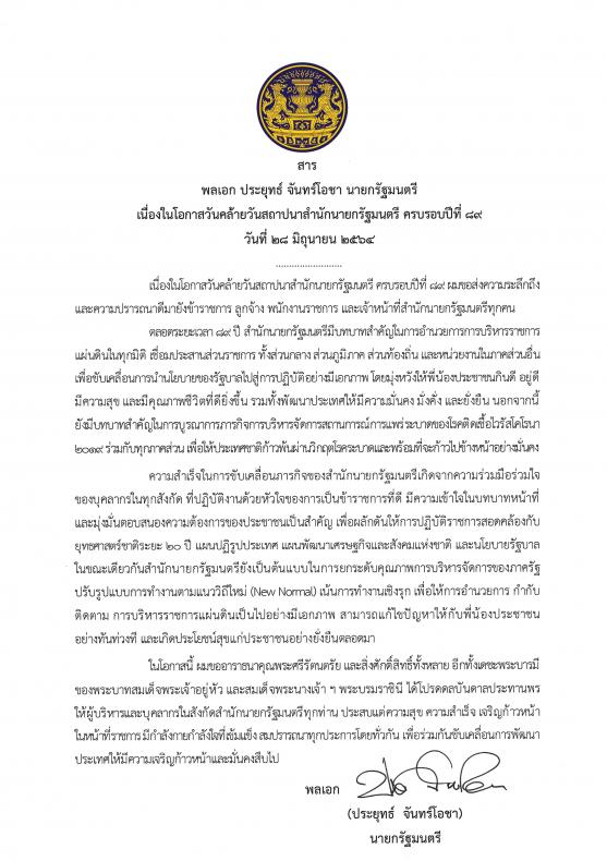 สารนายกรัฐมนตรี (พลเอก ประยุทธ์ จันทร์โอชา) เนื่องในโอกาสคล้ายวันสถาปนาสำนักนายกรัฐมนตรี ครบรอบปีที่ ๘๙ (๒๘ มิถุนายน ๒๕๖๔)