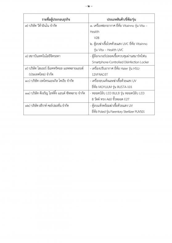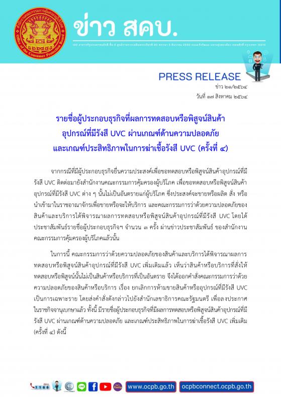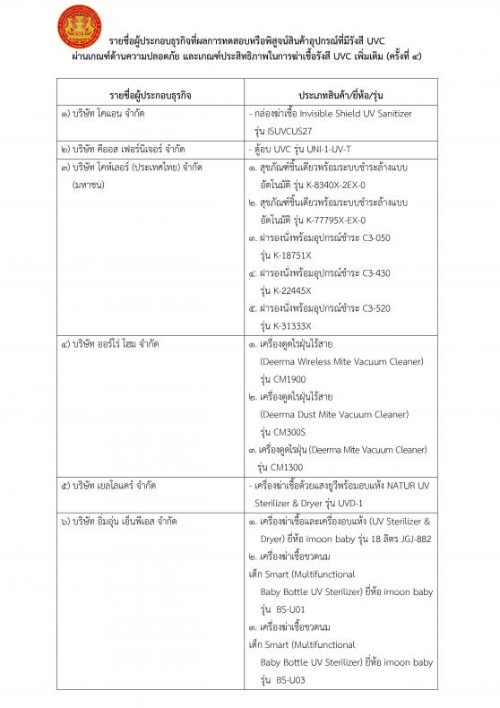 ประกาศรายชื่อผู้ประกอบการที่ผลการทดสอบหรือพิสูจน์สินค้าอุปกรณ์ที่มีรังสี​ UVC ผ่านเกณฑ์ด้านความปลอดภัยและเกณฑ์​ประสิทธิภาพในการฆ่าเชื้อรังสี​ UVC​(ครั้งที่​ 4)