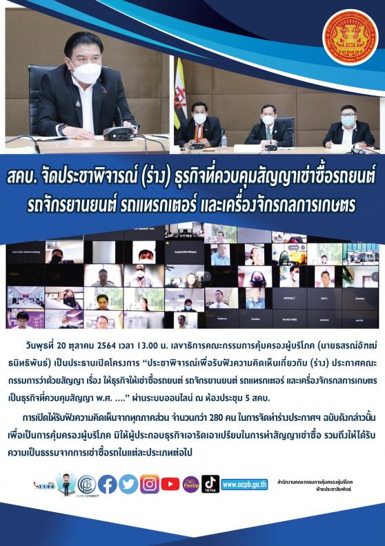สคบ. จัดประชาพิจารณ์ (ร่าง) ธุรกิจที่ควบคุมสัญญาเช่าซื้อรถยนต์ รถจักรยานยนต์ รถแทรกเตอร์ เเละเครื่องจักรกลการเกษตร