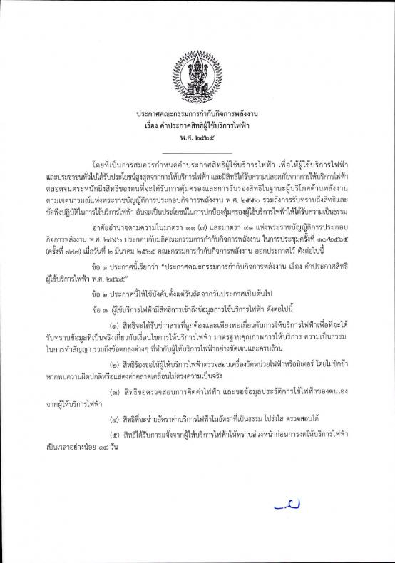 ประกาศคณะกรรมการกำกับกิจการพลังงาน เรื่องคำประกาศสิทธิผู้ใช้บริการไฟฟ้า พ.ศ.2565