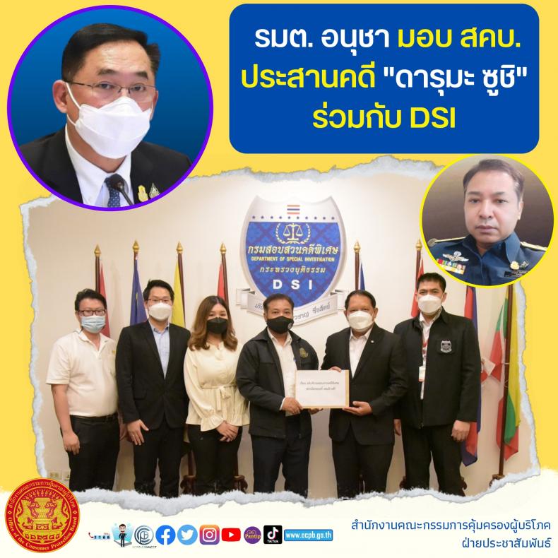 รัฐมนตรีประจำสำนักนายกรัฐมนตรี (นายอนุชา นาคาศัย) ได้มอบหมายให้ เลขาธิการคณะกรรมการคุ้มครองผู้บริโภค ประสานคดีร่วมกับกรมสอบสวนคดีพิเศษ (DSI) กรณีการซื้อคูปองล่วงหน้าของร้านอาหารบุฟเฟ่ต์ ดารุมะ ซูชิ  โดยในวันนี้ (22 มิถุนายน 2565) เลขาธิการคณะกรรมการคุ้มครองผู้บริโภค (นายธสรณ์อัฑฒ์ ธนิทธิพันธ์) ได้มอบหมายให้ นายจิติภัทร์ บุญสม ผู้อำนวยการกองคุ้มครองผู้บริโภคด้านโฆษณา นำตัวแทนผู้เสียหาย จำนวน 5 ราย จากกรณีการซื้อคูปองดังกล่าว มายื่นคำร้องทุกข์ต่อกรมสอบสวนคดีพิเศษ ซึ่งมี พันตำรวจตรี วรณัน ศรีล้ำ ผู้อำนวยการกองบริหารคดีพิเศษ เป็นผู้รับเรื่องในวันนี้ เบื้องต้นทาง DSI แจ้งว่าจะรีบรวบรวมพยานหลักฐานและนำเสนอคณะกรรมการเพื่อเป็นคดีพิเศษต่อไป