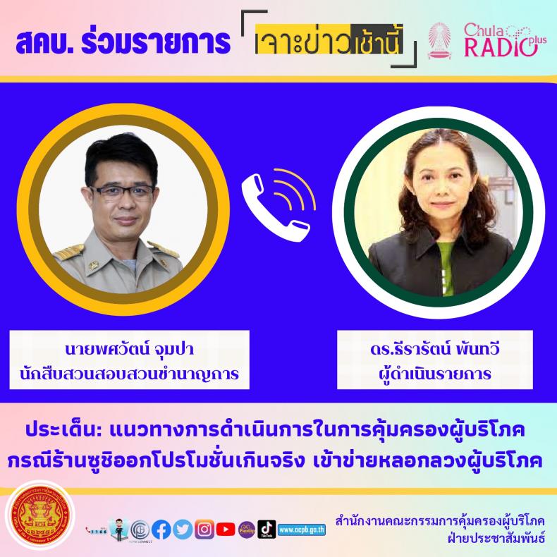วันพฤหัสบดีที่ 23 มิถุนายน 2565 เวลา 7.30 น. เลขาธิการคณะกรรมการคุ้มครองผู้บริโภค (นายธสรณ์อัฑฒ์ ธนิทธิพันธ์) โดยกองคุ้มครองผู้บริโภคด้านโฆษณา นายจิติภัทร์ บุญสม ผู้อำนวยการกองคุ้มครองผู้บริโภคด้านโฆษณา มอบหมายให้ นายพศวัตน์ จุมปา นักสืบสวนสอบสวนชำนาญการ รักษาการหัวหน้าฝ่ายเฝ้าระวังตรวจสอบโฆษณา ให้สัมภาษณ์สดทางโทรศัพท์ในรายการ "เจาะข่าวเช้านี้” ช่วงวิเคราะห์เจาะลึก ออกอากาศทาง Chula Radio Plus สถานีวิทยุจุฬาฯ FM 101.5 MHz. ดำเนินรายการโดย ดร.ธีรารัตน์ พันทวี ซึ่งเป็นการพูดคุยในประเด็น "แนวทางการดำเนินการในการคุ้มครองผู้บริโภค กรณีร้านซูชิออกโปรโมชั่นเกินจริงเข้าข่ายหลอกลวงผู้บริโภค”
