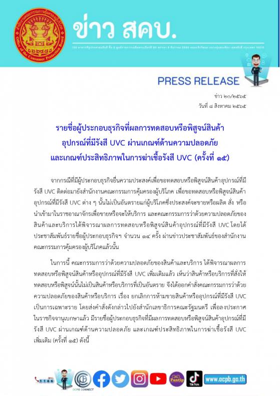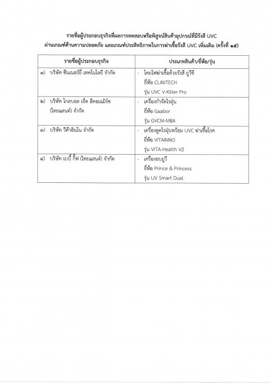 ประกาศรายชื่อผู้ประกอบธุรกิจที่ผลการทดสอบหรือพิสูจน์สินค้าอุปกรณ์ที่มีรังสี UVC ผ่านเกณฑ์ด้านความปลอดภัยและเกณฑ์ประสิทธิภาพในการฆ่าเชื้อรังสี UVC (ครั้งที่ 15)