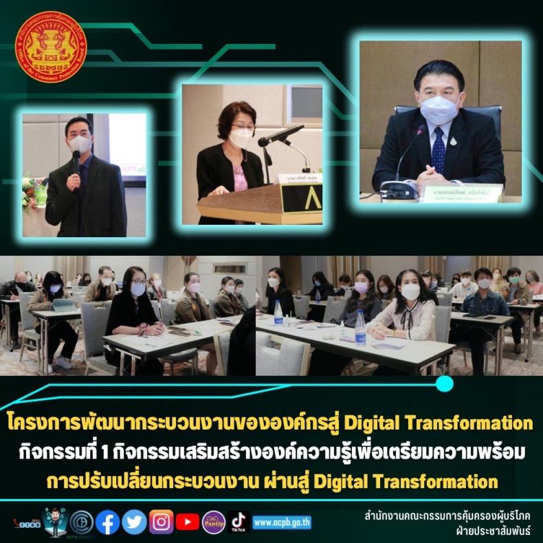 วันอังคารที่ 1 พฤศจิกายน 2565 เวลา 09.00 น. นายธสรณ์อัฑฒ์ ธนิทธิพันธ์ เลขาธิการคณะกรรมการคุ้มครองผู้บริโภค เป็นประธานเปิดโครงการพัฒนากระบวนงานขององค์กรสู่ Digital Transformation กิจกรรมที่ 1 กิจกรรมเสริมสร้างองค์ความรู้เพื่อเตรียมความพร้อมการปรับเปลี่ยนกระบวนงาน ผ่านสู่ Digital Transformation โดยมีนางสาวจรัสศรี ผดุงผล ผู้อำนวยการกองเผยแพร่และประชาสัมพันธ์ ปฎิบัติหน้าที่ผู้อำนวยการกลุ่มพัฒนาระบบบริหาร  เป็นผู้กล่าวรายงาน โดยมีวัตถุเพื่อสร้างความรู้ความเข้าใจและสร้างวัฒนธรรมการทำงานแบบ Digital Transformation ให้แก่บุคลากร สคบ. นำไปสู่การพัฒนากระบวนการหรือคิดค้นนวัตกรรมใหม่ ๆ ในการสนับสนุนการปฏิบัติงานขององค์กรและตอบสนองประชาชนผู้มาขอรับบริการ โดยมีนายนีรนาท นักดนตรี ผู้เชี่ยวชาญด้าน Digital Transformation เป็นวิทยากรบรรยายในหัวข้อ "แนวคิดการพัฒนาองค์กรด้วย Digital Transformation” "แนวคิดการพัฒนาและปรับปรุงกระบวนการทำงานสู่ Digital Transformation” "การออกแบบกระบวนการทางความคิดเพื่อการพัฒนานวัตกรรม (Design Thinking for Innovation Development)” และ "การวิเคราะห์ ค้นหานวัตกรรมขององค์กร” โดยมีบุคลากร สคบ. เข้าร่วมจำนวน 50 คน ณ ห้องพระมาตุลี 1-2 โรงแรมอัศวิน แกรนด์ คอนเวนชั่น หลักสี่ กรุงเทพมหานคร