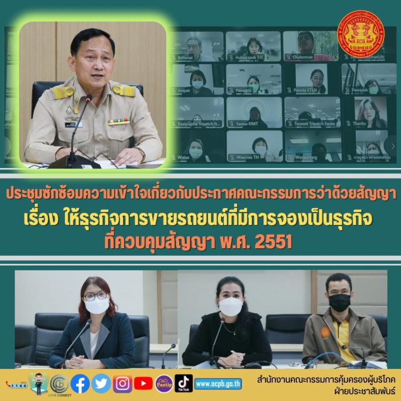 เมื่อวันจันทร์ที่ 28 พฤศจิกายน 2565 เวลา 13.00 น. นายธสรณ์อัฑฒ์ ธนิทธิพันธ์ เลขาธิการคณะกรรมการคุ้มครองผู้บริโภค มอบหมายให้ นายศุภกิตติ์ มะลิ ผู้อำนวยการกองคุ้มครองผู้บริโภคด้านสัญญา เป็นประธานการประชุมซักซ้อมความเข้าใจเกี่ยวกับประกาศคณะกรรมการว่าด้วยสัญญา เรื่อง ให้ธุรกิจการขายรถยนต์ที่มีการจองเป็นธุรกิจที่ควบคุมสัญญา พ.ศ. 2551 เพื่อเป็นการซักซ้อมความเข้าใจและให้ผู้ประกอบธุรกิจจำหน่ายรถยนต์ที่มีการจองได้ปฏิบัติได้ถูกต้องตามกฏหมายเนื่องจากจะมีการจัดงานมหกรรมยานยนต์ ครั้งที่ 39 (Motor Expo 2022) ระหว่างวันที่ 1 ธันวาคม 2565 – 12 ธันวาคม 2565 ณ อาคารชาเลนเจอร์ 1 – 3 อิมแพค เมืองทองธานี จังหวัดนนทบุรี เพื่อสร้างความเชื่อมั่นให้ผู้บริโภคให้ได้รับความเป็นธรรมในการทำสัญญาจองซื้อรถยนต์ ณ ห้องประชุม 1 สำนักงานคณะกรรมการคุ้มครองผู้บริโภค ผ่านระบบประชุมทางไกล (Video Conference) ระบบ Cisco Webex Meetings