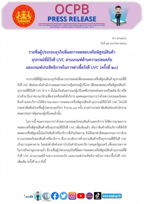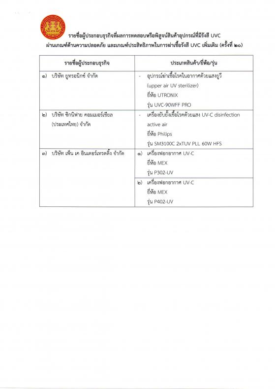 ประกาศรายชื่อผู้ประกอบธุรกิจที่ผลการทดสอบหรือพิสูจน์สินค้าอุปกรณ์ที่มีรังสี UVC ผ่านเกณฑ์ด้านความปลอดภัยและเกณฑ์ประสิทธิภาพในการฆ่าเชื้อรังสี UVC (ครั้งที่ 20)