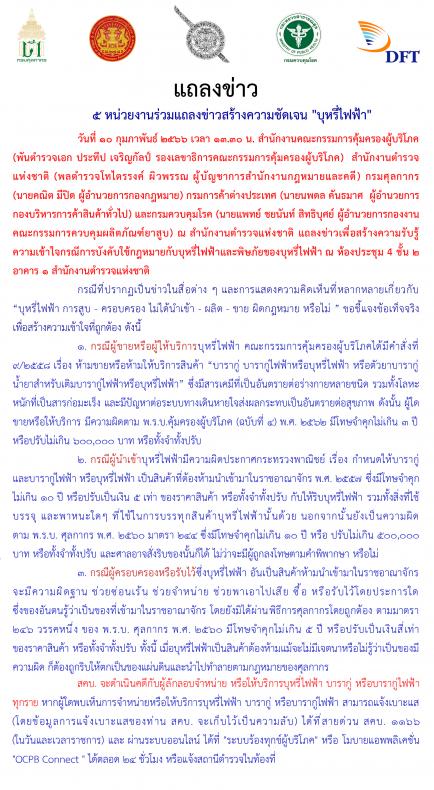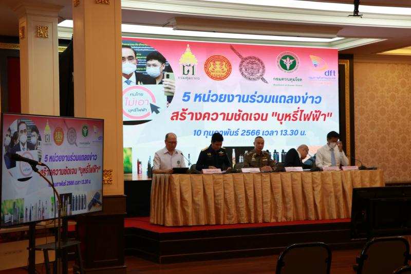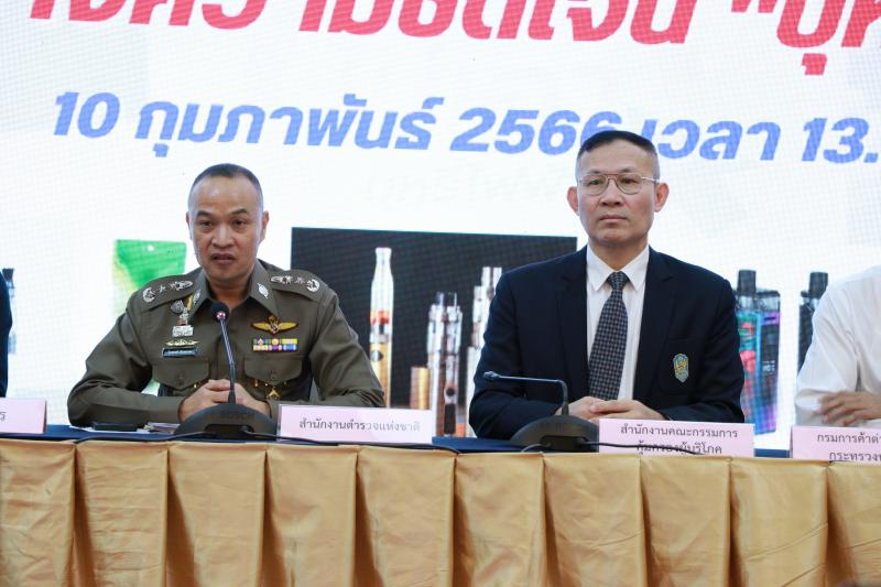 วันที่ ๑๐ กุมภาพันธ์ ๒๕๖๖ เวลา ๑๓.๓๐ น. สำนักงานคณะกรรมการคุ้มครองผู้บริโภค (พันตำรวจเอก ประทีป เจริญกัลป์ รองเลขาธิการคณะกรรมการคุ้มครองผู้บริโภค) สำนักงานตำรวจแห่งชาติ (พลตำรวจโทไตรรงค์ ผิวพรรณ ผู้บัญชาการสำนักงานกฎหมายและคดี) กรมศุลกากร (นายคณิต มีปิด ผู้อำนวยการกองกฎหมาย) กรมการค้าต่างประเทศ (นายนพดล คันธมาศ  ผู้อำนวยการกองบริหารการค้าสินค้าทั่วไป) และกรมควบคุมโรค (นายแพทย์ ชยนันท์ สิทธิบุศย์ ผู้อำนวยการกองงานคณะกรรมการควบคุมผลิตภัณฑ์ยาสูบ) ณ สำนักงานตำรวจแห่งชาติ แถลงข่าวเพื่อสร้างความรับรู้ความเข้าใจกรณีการบังคับใช้กฎหมายกับบุหรี่ไฟฟ้าและพิษภัยของบุหรี่ไฟฟ้า ณ ห้องประชุม 4 ชั้น ๒ อาคาร ๑ สำนักงานตำรวจแห่งชาติ