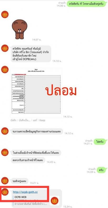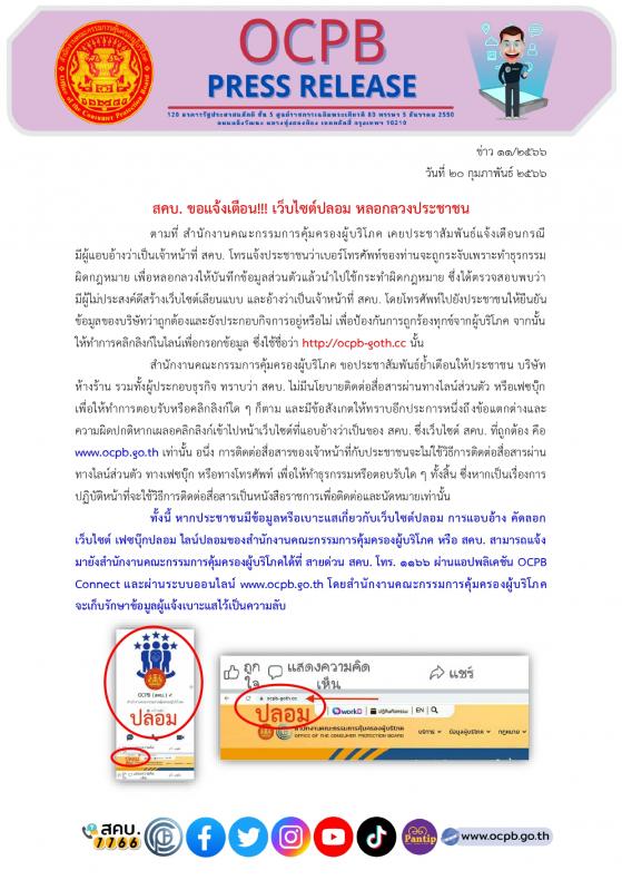 ตามที่ สำนักงานคณะกรรมการคุ้มครองผู้บริโภค เคยประชาสัมพันธ์แจ้งเตือนกรณีมีผู้แอบอ้างว่าเป็นเจ้าหน้าที่ สคบ. โทรแจ้งประชาชนว่าเบอร์โทรศัพท์ของท่านจะถูกระงับเพราะทำธุรกรรมผิดกฎหมาย เพื่อหลอกลวงให้บันทึกข้อมูลส่วนตัวแล้วนำไปใช้กระทำผิดกฎหมาย ซึ่งได้ตรวจสอบพบว่ามีผู้ไม่ประสงค์ดีสร้างเว็บไซต์เลียนแบบ และอ้างว่าเป็นเจ้าหน้าที่ สคบ. โดยโทรศัพท์ไปยังประชาชนให้ยืนยันข้อมูลของบริษัทว่าถูกต้องและยังประกอบกิจการอยู่หรือไม่ เพื่อป้องกันการถูกร้องทุกข์จากผู้บริโภค จากนั้นให้ทำการคลิกลิงก์ในไลน์เพื่อกรอกข้อมูล ซึ่งใช้ชื่อว่า http://ocpb-goth.cc นั้น