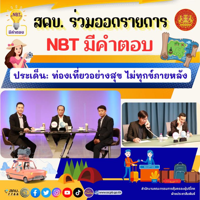 วันศุกร์ที่ 3 มีนาคม พ.ศ. 2566 เวลา 15.05 น. เลขาธิการคณะกรรมการคุ้มครองผู้บริโภค (นายธสรณ์อัฑฒ์ ธนิทธิพันธ์) มอบหมายให้ นายมานะ บุญส่ง ผู้อำนวยการฝ่ายรับเรื่องราวร้องทุกข์ด้านโฆษณา กองคุ้มครองผู้บริโภคด้านโฆษณา และนายพศวัตน์ จุมปา นักสืบสวนสอบสวนชำนาญการ กองคุ้มครองผู้บริโภคด้านโฆษณา ร่วมรายการ "NBT มีคำตอบ” ออกอากาศทางช่อง 2 NBT และ Facebook Live : LiveNBT2HD ในประเด็น : ท่องเที่ยวอย่างสุข ไม่ทุกข์ภายหลัง ซึ่งมีการให้สัมภาษณ์ในเรื่องของปัญหาร้องทุกข์จากผลกระทบการท่องเที่ยว สคบ. มีการดำเนินการอย่างไร จากการซื้อแพ็กเกจท่องเที่ยว แต่วีซ่าไม่ผ่าน ผู้บริโภคจะสามารถขอเงินคืนได้หรือไม่ หากสายการบินเกิดมีความล่าช้า ผู้บริโภคจะสามารถร้องทุกข์ต่อ สคบ. ได้หรือไม่ รวมทั้งคำแนะนำจาก สคบ. ในเรื่องการท่องเที่ยวตามนโยบายภาครัฐ