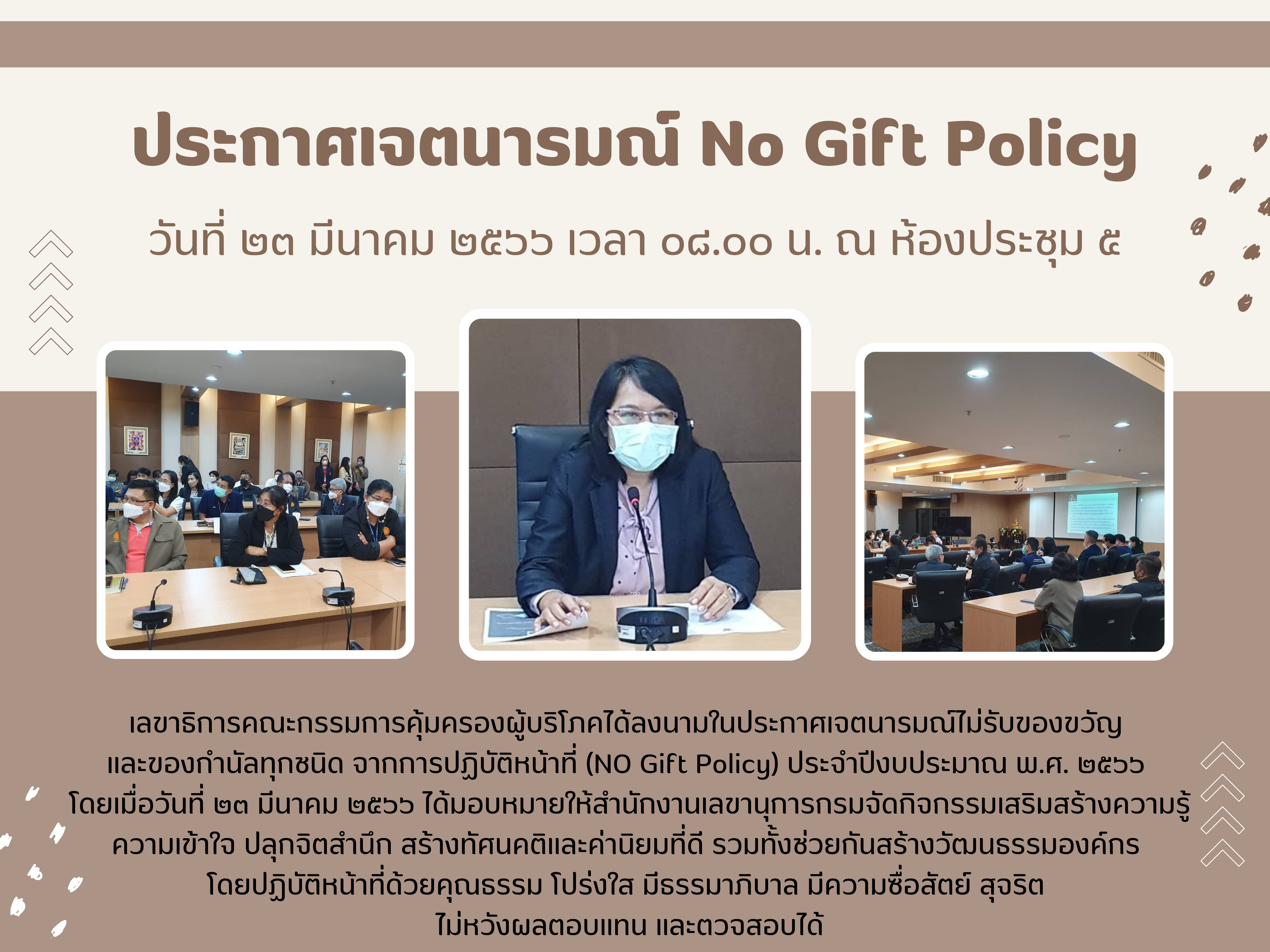 วันที่ ๒๓ มีนาคม ๒๕๖๖ เวลา ๐๘.๐๐ น. ณ ห้องประชุม ๕ เลขาธิการคณะกรรมการคุ้มครองผู้บริโภคได้ลงนามในประกาศเจตนารมณ์ไม่รับของขวัญและของกำนัลทุกชนิด จากการปฏิบัติหน้าที่ (NO Gift Policy) ประจำปีงบประมาณ พ.ศ. ๒๕๖๖ และ ได้มอบหมายให้สำนักงานเลขานุการกรมจัดกิจกรรมเสริมสร้างความรู้ความเข้าใจ ปลุกจิตสำนึก สร้างทัศนคติและค่านิยมที่ดี  รวมทั้งช่วยกันสร้างวัฒนธรรมองค์กร โดยปฏิบัติหน้าที่ด้วยคุณธรรม โปร่งใส มีธรรมาภิบาล มีความซื่อสัตย์ สุจริต ไม่หวังผลตอบแทน และตวจสอบได้