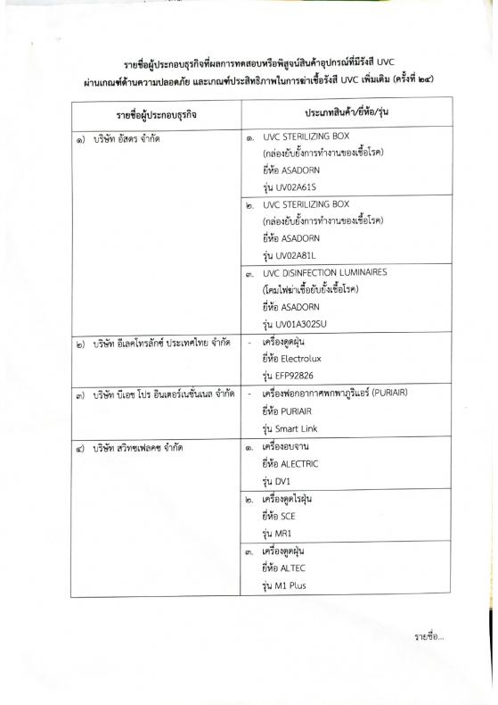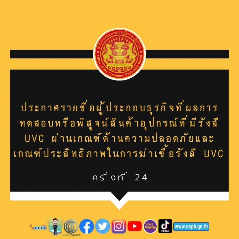 ประกาศรายชื่อผู้ประกอบธุรกิจที่ผลการทดสอบหรือพิสูจน์สินค้าอุปกรณ์ที่มีรังสี UVC ผ่านเกณฑ์ด้านความปลอดภัยและเกณฑ์ประสิทธิภาพในการฆ่าเชื้อรังสี UVC (ครั้งที่ 24)