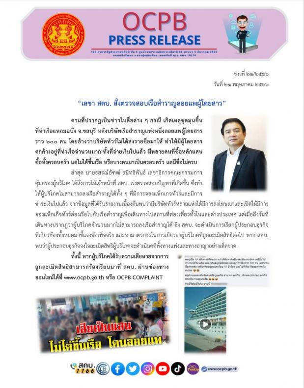 ล่าสุด นายธสรณ์อัฑฒ์ ธนิทธิพันธ์ เลขาธิการคณะกรรมการคุ้มครองผู้บริโภค ได้สั่งการให้เจ้าหน้าที่ สคบ. เร่งตรวจสอบปัญหาที่เกิดขึ้น ซึ่งทำให้ผู้บริโภคไม่สามารถลงเรือสำราญได้ทั้ง ๆ ที่มีการจองแพ็กเกจทัวร์และมีการชำระเงินไปแล้ว จากข้อมูลที่ได้รับรายงานเบื้องต้นพบว่ามีบริษัททัวร์หลายแห่งได้มีการลงโฆษณาและเปิดให้มีการจองแพ็กเก็จทัวร์ล่องเรือไปกับเรือสำราญเพื่อเดินทางไปสถานที่ท่องเที่ยวทั้งในและต่างประเทศ แต่เมื่อถึงวันที่เดินทางปรากฏว่าผู้บริโภคจำนวนมากไม่สามารถลงเรือสำราญได้ ซึ่ง สคบ. จะดำเนินการเรียกผู้ประกอบธุรกิจ