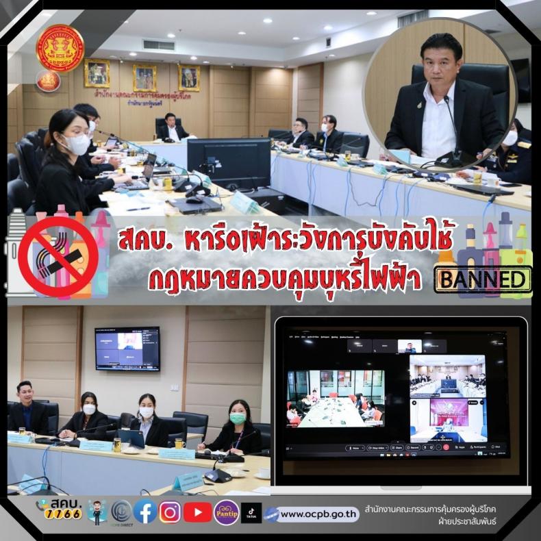 วันอังคารที่ 20 มิถุนายน 2566 เวลา 9.30 น. เลขาธิการคณะกรรมการคุ้มครองผู้บริโภค (นายธสรณ์อัฑฒ์ ธนิทธิพันธ์ ) เป็นประธานในการประชุมหารือเฝ้าระวังและการบังคับใช้กฎหมายควบคุมบุหรี่ไฟฟ้า โดยเชิญหน่วยงานที่เกี่ยวข้องประกอบด้วย กระทรวงดิจิทัลเพื่อเศรษฐกิจและสังคม กรมศุลกากร กรมสรรพสามิต กรมควบคุมโรค สำนักงานปลัดกระทรวงมหาดไทย สำนักงานปลัดกระทรวงสาธารณสุข และสำนักงานตำรวจแห่งชาติ ณ ห้องประชุม 1 สคบ. และผ่านระบบการประชุมทางไกล ( Video Conference)