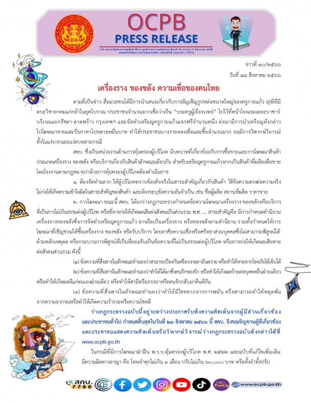๒. การโฆษณา ขณะนี้ สคบ. ได้ยกร่างกฎกระทรวงกำหนดข้อความโฆษณาเครื่องราง ของขลังหรือบริการ
