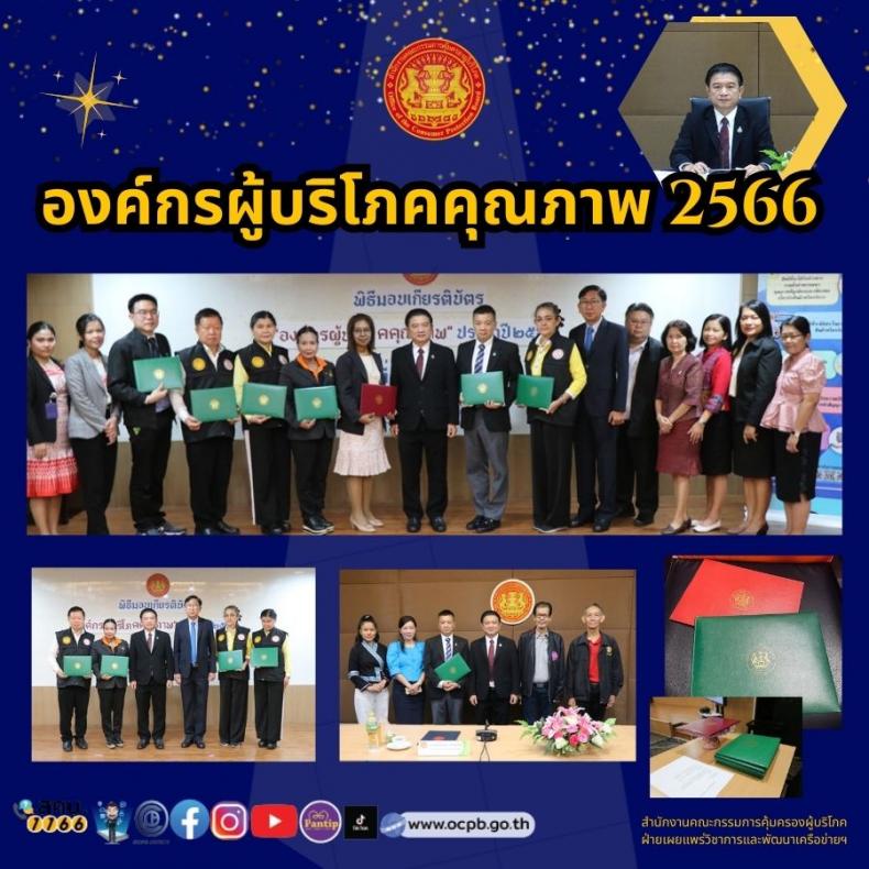 วันศุกร์ที่ 1 กันยายน 2566 เวลา 09.00 น. เลขาธิการคณะกรรมการคุ้มครองผู้บริโภค (นายธสรณ์อัฑฒ์  ธนิทธิพันธ์) เป็นประธานในพิธีมอบเกียรติบัตร "องค์กรผู้บริโภคคุณภาพ" ประจำปี พ.ศ. 2566 ณ ห้องประชุม 5 สำนักงานคณะกรรมการคุ้มครองผู้บริโภค โดยในปี พ.ศ. 2566 มีองค์กรของผู้บริโภคที่มีคุณสมบัติตามหลักเกณฑ์ และผ่านการพิจารณาของคณะกรรมการประเมินองค์กรผู้บริโภคคุณภาพ จำนวน 8 องค์กร ได้แก่